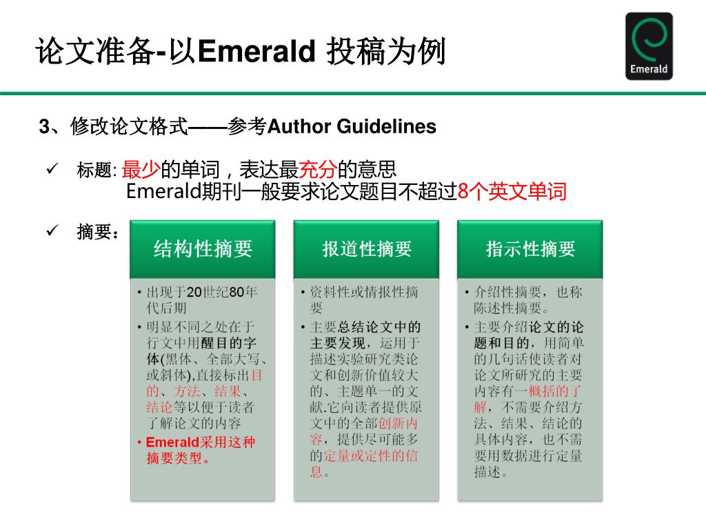 标题: 最少的单词,表达最充分的意思 Emerald期刊一般要求论文题目不超过8个英文单词 摘要: 论文准备-以Emerald 投稿为例 3、修改论文格式——参考Author Guidelines