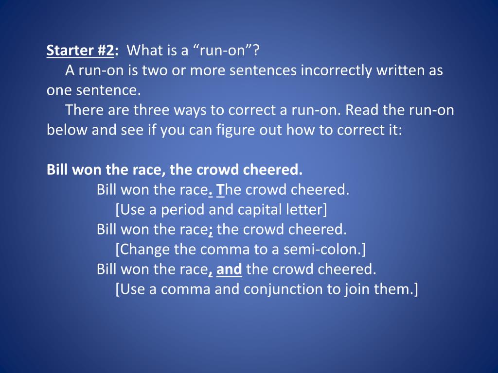 Starter #2: What is a “run-on”? A run-on is two or more sentences incorrectly written as one sentence. There are three ways to correct a run-on. Read the run-on below and see if you can figure out how to correct it: Bill won the race, the crowd cheered. Bill won the race.The crowd cheered. [Use a period and capital letter] Bill won the race; the crowd cheered. [Change the comma to a semi-colon.] Bill won the race,and the crowd cheered. [Use a comma and conjunction to join them.]