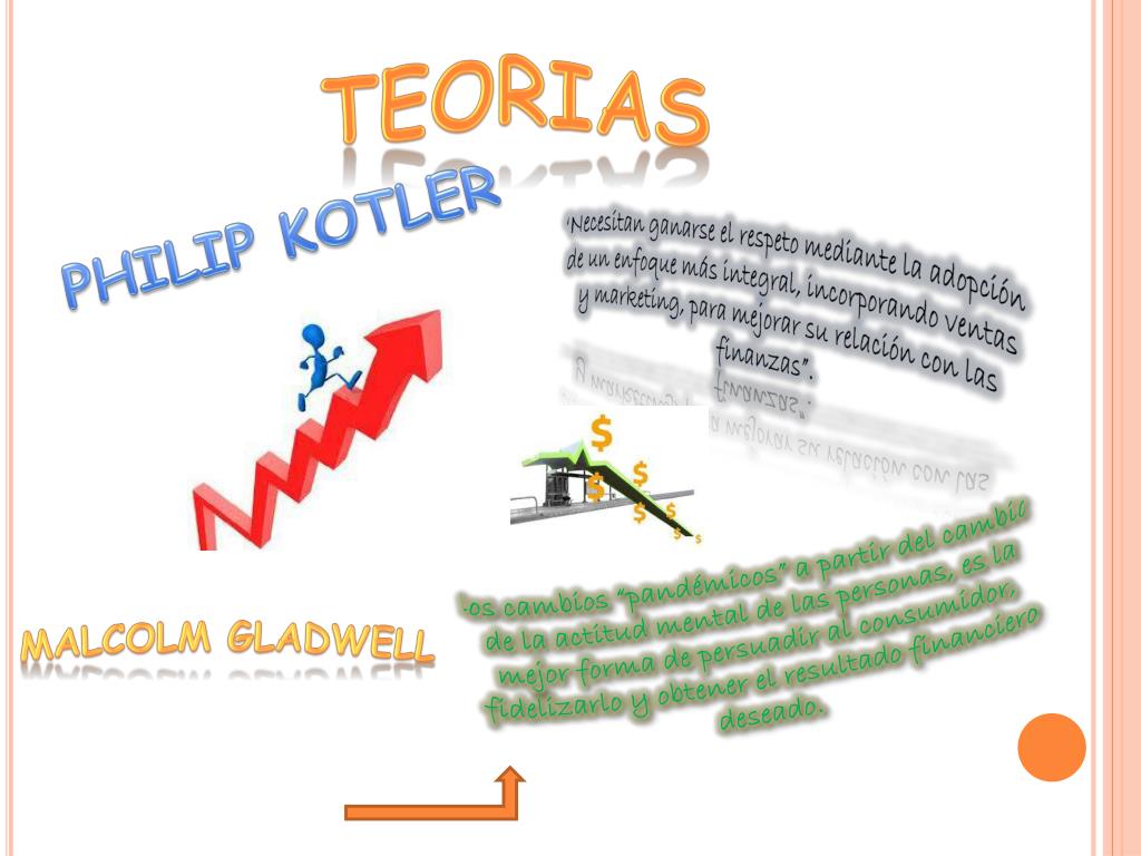 TEORIAS PHILIP KOTLER “Necesitan ganarse el respeto mediante la adopción de un enfoque más integral, incorporando ventas y marketing, para mejorar su relación con las finanzas”. los cambios “pandémicos” a partir del cambio de la actitud mental de las personas, es la mejor forma de persuadir al consumidor, fidelizarlo y obtener el resultado financiero deseado. MALCOLM GLADWELL