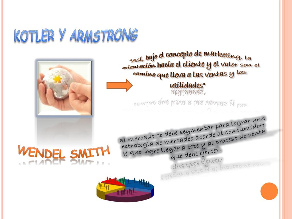KOTLER Y ARMSTRONG “Así, bajo el concepto de marketing, la orientación hacia el cliente y el valor son el camino que lleva a las ventas y las utilidades" El mercado se debe segmentar para lograr una estrategia de mercadeo acorde al consumidor; y que logre llegar a este y al proceso de venta que debe ejercer. WENDEL SMITH