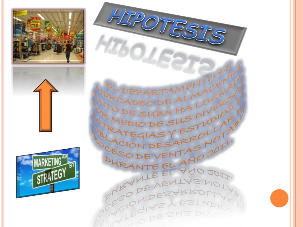 HIPOTESIS El departamento de mercadeo de almacenes ÉXITO de Suba ha logrado por medio de sus diversas estrategias y estudios de población DESARROLLAR UN PROCESO De ventas NOTABLE durante el año 2011.