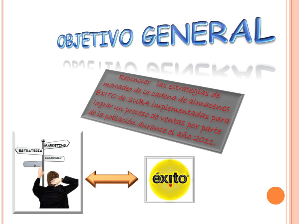 OBJETIVO GENERAL Reconocer las estrategias de mercadeo de la cadena de almacenes ÉXITO de SUBA implementadas para lograr un proceso de ventas por parte de la población durante el año 2011.
