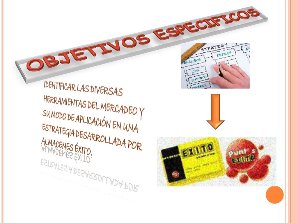 OBJETIVOS ESPECIFICOS IDENTIFICAR LAS DIVERSAS HERRAMIENTAS DEL MERCADEO Y SU MODO DE APLICACIÓN EN UNA ESTRATEGIA DESARROLLADA POR ALMACENES ÉXITO.