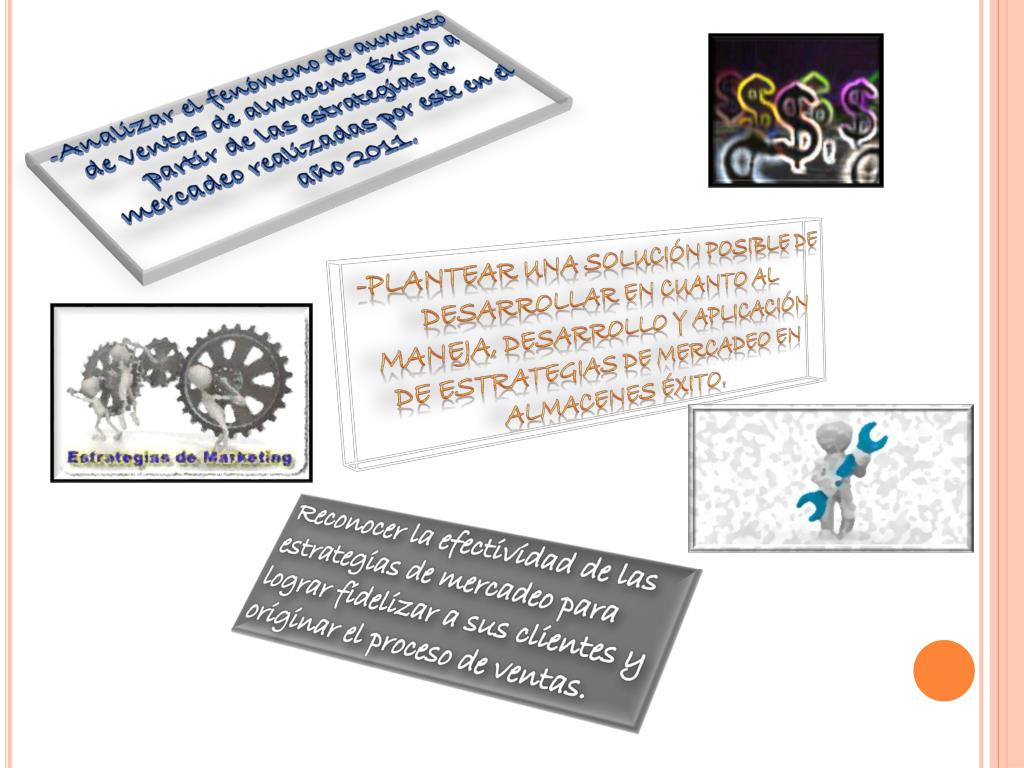 -Analizar el fenómeno de aumento de ventas de almacenes ÉXITO a partir de las estrategias de mercadeo realizadas por este en el año 2011. -Plantear una solución posible de desarrollar en cuanto al maneja, desarrollo y aplicación de estrategias de mercadeo en almacenes ÉXITO. Reconocer la efectividad de las estrategias de mercadeo para lograr fidelizar a sus clientes y originar el proceso de ventas.