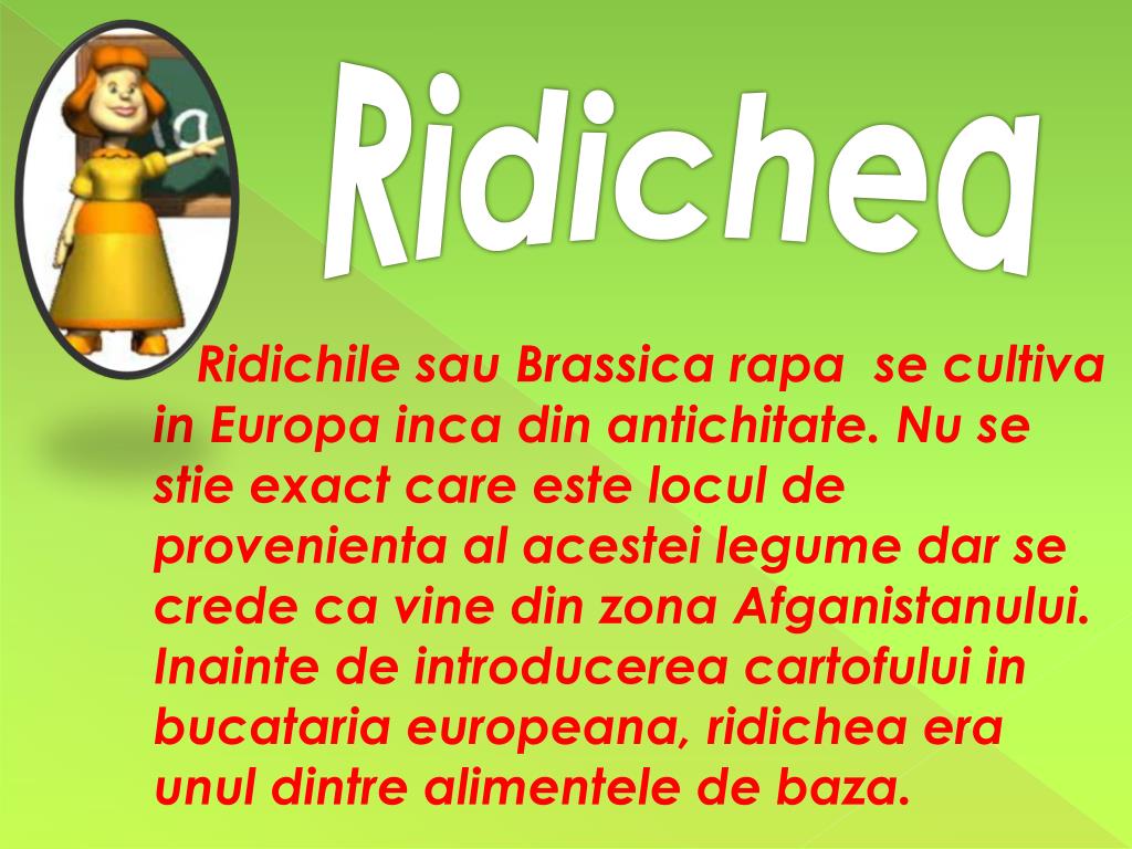 Ridichea Ridichile sau Brassica rapa se cultiva in Europa inca din antichitate. Nu se stie exact care este locul de provenienta al acestei legume dar se crede ca vine din zona Afganistanului. Inainte de introducerea cartofului in bucataria europeana, ridichea era unul dintre alimentele de baza.
