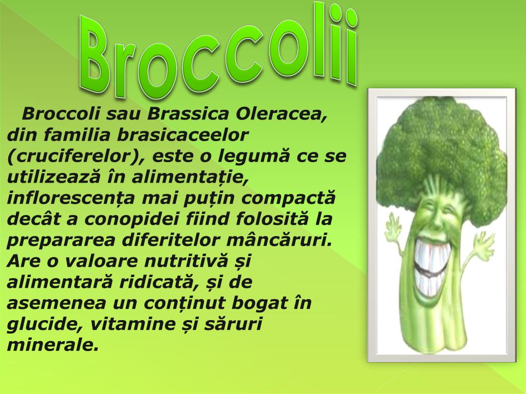 Broccolii Broccoli sau Brassica Oleracea, din familia brasicaceelor (cruciferelor), este o legumă ce se utilizează în alimentație, inflorescența mai puțin compactă decât a conopidei fiind folosită la prepararea diferitelor mâncăruri. Are o valoare nutritivă și alimentară ridicată, și de asemenea un conținut bogat în glucide, vitamine și săruri minerale.