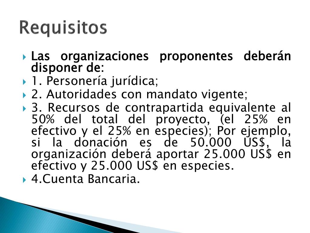 Requisitos • Las organizaciones proponentes deberán disponer de: • 1. Personería jurídica; • 2. Autoridades con mandato vigente; • 3. Recursos de contrapartida equivalente al 50% del total del proyecto, (el 25% en efectivo y el 25% en especies); Por ejemplo, si la donación es de 50.000 US$, la organización deberá aportar 25.000 US$ en efectivo y 25.000 US$ en especies. • 4.Cuenta Bancaria.