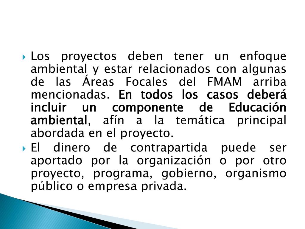 Los proyectos deben tener un enfoque ambiental y estar relacionados con algunas de las Áreas Focales del FMAM arriba mencionadas. En todos los casos deberá incluir un componente de Educación ambiental, afín a la temática principal abordada en el proyecto. • El dinero de contrapartida puede ser aportado por la organización o por otro proyecto, programa, gobierno, organismo público o empresa privada.
