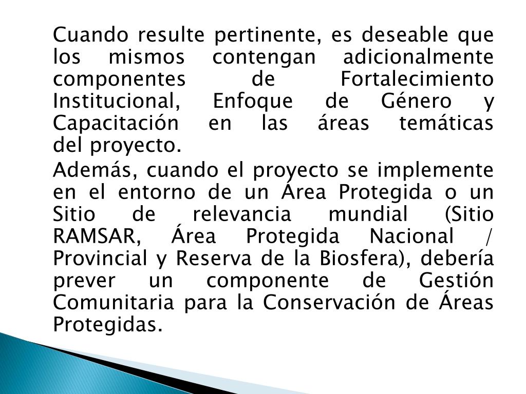 Cuando resulte pertinente, es deseable que los mismos contengan adicionalmente componentes de Fortalecimiento Institucional, Enfoque de Género y Capacitación en las áreas temáticas del proyecto. Además, cuando el proyecto se implemente en el entorno de un Área Protegida o un Sitio de relevancia mundial (Sitio RAMSAR, Área Protegida Nacional / Provincial y Reserva de la Biosfera), debería prever un componente de Gestión Comunitaria para la Conservación de Áreas Protegidas.