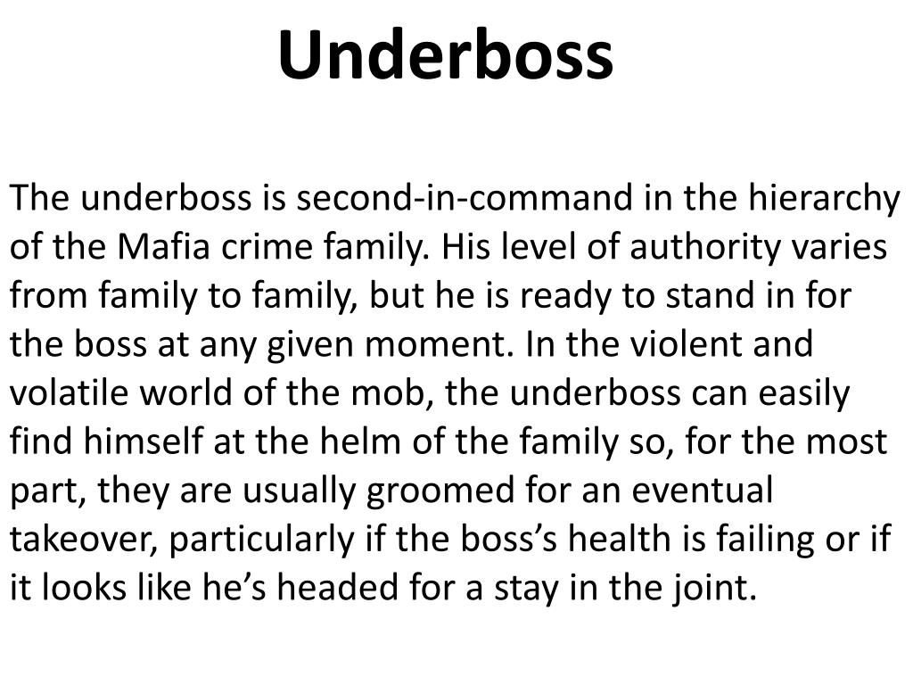 Underboss The underboss is second-in-command in the hierarchy of the Mafia crime family. His level of authority varies from family to family, but he is ready to stand in for the boss at any given moment. In the violent and volatile world of the mob, the underboss can easily find himself at the helm of the family so, for the most part, they are usually groomed for an eventual takeover, particularly if the boss’s health is failing or if it looks like he’s headed for a stay in the joint.