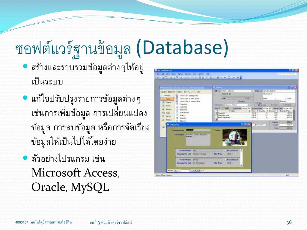 ซอฟต์แวร์ฐานข้อมูล (Database) • สร้างและรวบรวมข้อมูลต่างๆให้อยู่เป็นระบบ • แก้ไขปรับปรุงรายการข้อมูลต่างๆ เช่นการเพิ่มข้อมูล การเปลี่ยนแปลงข้อมูล การลบข้อมูล หรือการจัดเรียงข้อมูลให้เป็นไปได้โดยง่าย • ตัวอย่างโปรแกรม เช่น MicrosoftAccess, Oracle, MySQL บทที่ 3 คอมพิวเตอร์ซอฟต์แวร์