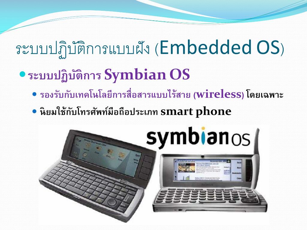ระบบปฏิบัติการแบบฝัง (EmbeddedOS) • ระบบปฏิบัติการ SymbianOS • รองรับกับเทคโนโลยีการสื่อสารแบบไร้สาย (wireless) โดยเฉพาะ • นิยมใช้กับโทรศัพท์มือถือประเภท smartphone