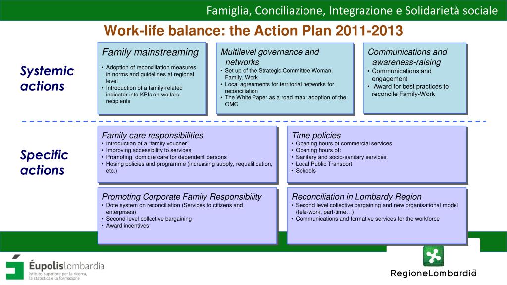 Family care responsibilities • Introduction of a “family voucher” • Improving accessibility to services • Promoting domicile care for dependent persons • Hosing policies and programme (increasing supply, requalification, etc.) • Time policies • Opening hours of commercial services • Opening hours of: • Sanitary and socio-sanitary services • Local Public Transport • Schools • Promoting Corporate Family Responsibility • Dote system on reconciliation (Services to citizens and enterprises) • Second-level collective bargaining • Award incentives • Reconciliation in Lombardy Region • Second level collective bargaining and new organisational model (tele-work, part-time…) • Communications and formative services for the workforce Work-life balance: the Action Plan 2011-2013 • Family mainstreaming • Adoption of reconciliation measures in norms and guidelines at regional level • Introduction of a family-related indicator into KPIs on welfare recipients • Multilevel governance and networks • Set up of the Strategic Committee Woman, Family, Work • Local agreements for territorial networks for reconciliation • The White Paper as a road map: adoption of the OMC • Communications and awareness-raising • Communications and engagement • Award for best practices to reconcile Family-Work Systemic actions Specific actions