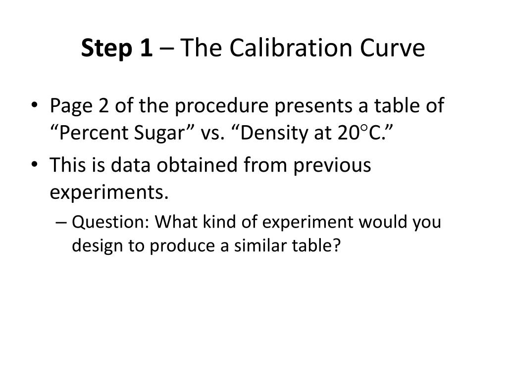 Step 1 – The Calibration Curve • Page 2 of the procedure presents a table of “Percent Sugar” vs. “Density at 20°C.” • This is data obtained from previous experiments. • Question: What kind of experiment would you design to produce a similar table?