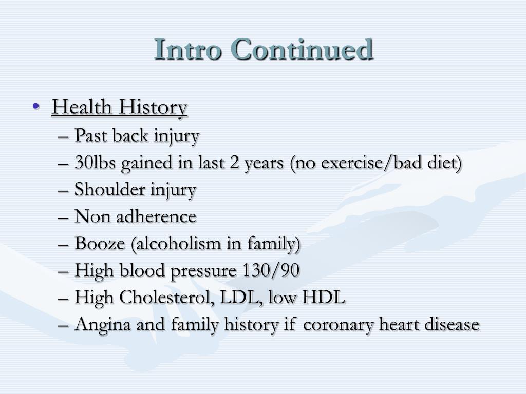 Intro Continued • Health History • Past back injury • 30lbs gained in last 2 years (no exercise/bad diet) • Shoulder injury • Non adherence • Booze (alcoholism in family) • High blood pressure 130/90 • High Cholesterol, LDL, low HDL • Angina and family history if coronary heart disease