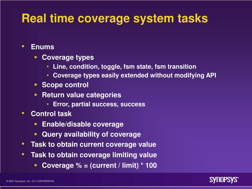 Real time coverage user API • C equivalent to the system tasks • Addresses coverage reactivity requirements of HLVs and C testbenches • Enums • Equivalent to the coverage enums in SV • cm_coverage() • cm_get_coverage() • cm_get_limit()