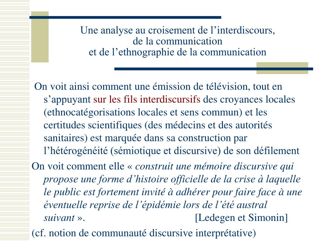 Une analyse au croisement de l’interdiscours, de la communication et de l’ethnographie de la communication On voit ainsi comment une émission de télévision, tout en s’appuyant sur les filsinterdiscursifs des croyances locales (ethnocatégorisations locales et sens commun) et les certitudes scientifiques (des médecins et des autorités sanitaires) est marquée dans sa construction par l’hétérogénéité (sémiotique et discursive) de son défilement On voit comment elle « construit une mémoire discursive qui propose une forme d’histoire officielle de la crise à laquelle le public est fortement invité à adhérer pour faire face à une éventuelle reprise de l’épidémie lors de l’été austral suivant ». [Ledegen et Simonin] (cf. notion de communauté discursive interprétative)