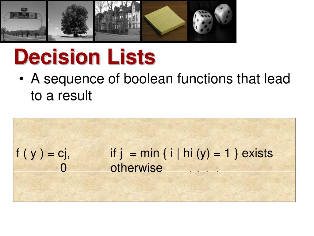 Decision Lists • A sequence of boolean functions that lead to a result • if h1 (y) = 1 then set f (y) = c1 else if h2 (y) = 1 then set f (y) = c2 …. else set f (y) = cn f ( y ) = cj, if j = min { i | hi (y) = 1 } exists 0 otherwise
