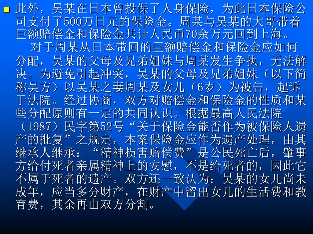 此外,吴某在日本曾投保了人身保险,为此日本保险公司支付了500万日元的保险金。周某与吴某的大哥带着巨额赔偿金和保险金共计人民币70余万元回到上海。 对于周某从日本带回的巨额赔偿金和保险金应如何分配,吴某的父母及兄弟姐妹与周某发生争执,无法解决。为避免引起冲突,吴某的父母及兄弟姐妹(以下简称吴方)以吴某之妻周某及女儿(6岁)为被告,起诉于法院。经过协商,双方对赔偿金和保险金的性质和某些分配原则有一定的共同认识。根据最高人民法院(1987)民字第52号“关于保险金能否作为被保险人遗产的批复”之规定,本案保险金应作为遗产处理,由其继承人继承:“精神损害赔偿费”是公民死亡后,肇事方给付死者亲属精神上的安慰,不是给死者的,因此它不属于死者的遗产。双方还一致认为:吴某的女儿尚未成年,应当多分财产,在财产中留出女儿的生活费和教育费,其余再由双方分割。