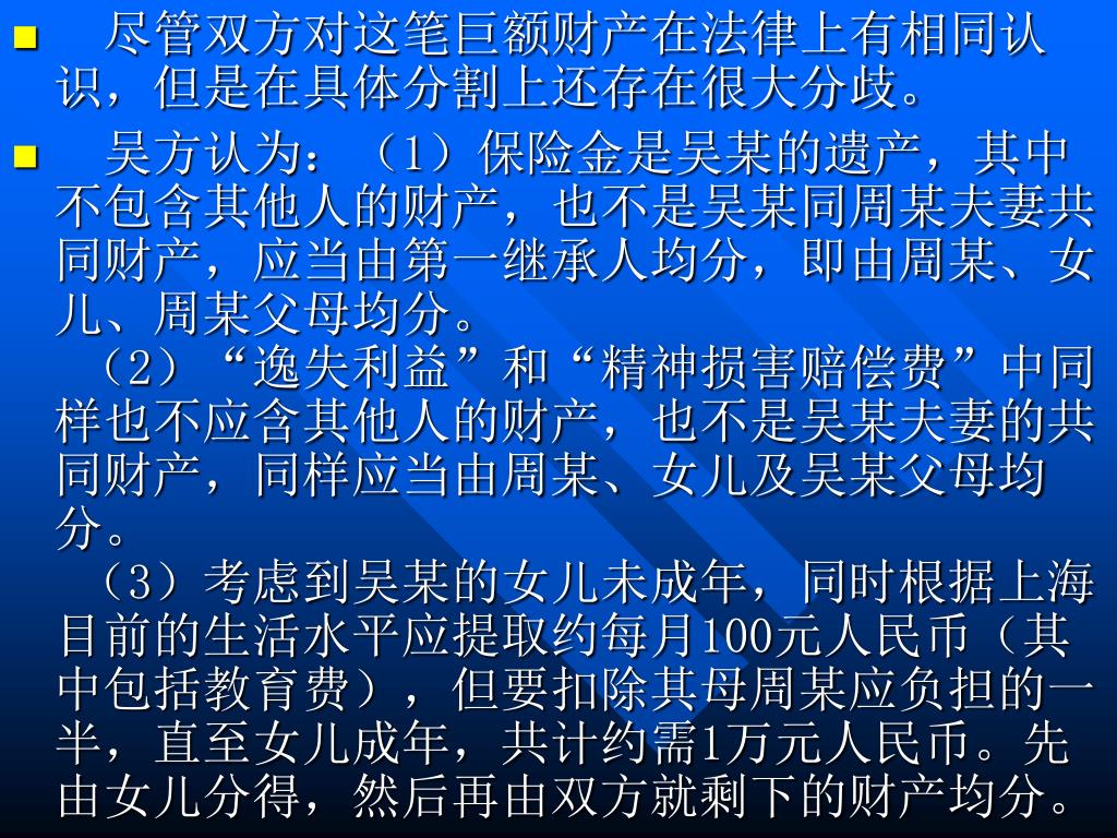 尽管双方对这笔巨额财产在法律上有相同认识,但是在具体分割上还存在很大分歧。尽管双方对这笔巨额财产在法律上有相同认识,但是在具体分割上还存在很大分歧。 • 吴方认为:(1)保险金是吴某的遗产,其中不包含其他人的财产,也不是吴某同周某夫妻共同财产,应当由第一继承人均分,即由周某、女儿、周某父母均分。 (2)“逸失利益”和“精神损害赔偿费”中同样也不应含其他人的财产,也不是吴某夫妻的共同财产,同样应当由周某、女儿及吴某父母均分。 (3)考虑到吴某的女儿未成年,同时根据上海目前的生活水平应提取约每月100元人民币(其中包括教育费),但要扣除其母周某应负担的一半,直至女儿成年,共计约需1万元人民币。先由女儿分得,然后再由双方就剩下的财产均分。