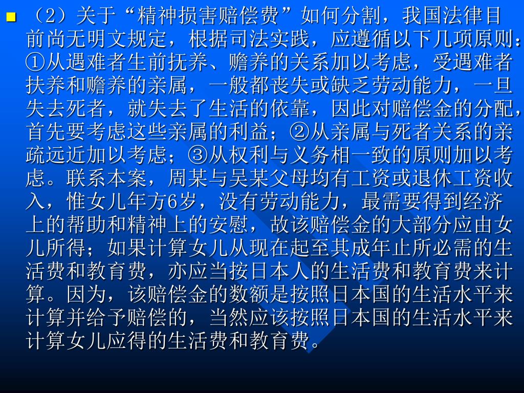 (2)关于“精神损害赔偿费”如何分割,我国法律目前尚无明文规定,根据司法实践,应遵循以下几项原则:①从遇难者生前抚养、赡养的关系加以考虑,受遇难者扶养和赡养的亲属,一般都丧失或缺乏劳动能力,一旦失去死者,就失去了生活的依靠,因此对赔偿金的分配,首先要考虑这些亲属的利益;②从亲属与死者关系的亲疏远近加以考虑;③从权利与义务相一致的原则加以考虑。联系本案,周某与吴某父母均有工资或退休工资收入,惟女儿年方6岁,没有劳动能力,最需要得到经济上的帮助和精神上的安慰,故该赔偿金的大部分应由女儿所得;如果计算女儿从现在起至其成年止所必需的生活费和教育费,亦应当按日本人的生活费和教育费来计算。因为,该赔偿金的数额是按照日本国的生活水平来计算并给予赔偿的,当然应该按照日本国的生活水平来计算女儿应得的生活费和教育费。(2)关于“精神损害赔偿费”如何分割,我国法律目前尚无明文规定,根据司法实践,应遵循以下几项原则:①从遇难者生前抚养、赡养的关系加以考虑,受遇难者扶养和赡养的亲属,一般都丧失或缺乏劳动能力,一旦失去死者,就失去了生活的依靠,因此对赔偿金的分配,首先要考虑这些亲属的利益;②从亲属与死者关系的亲疏远近加以考虑;③从权利与义务相一致的原则加以考虑。联系本案,周某与吴某父母均有工资或退休工资收入,惟女儿年方6岁,没有劳动能力,最需要得到经济上的帮助和精神上的安慰,故该赔偿金的大部分应由女儿所得;如果计算女儿从现在起至其成年止所必需的生活费和教育费,亦应当按日本人的生活费和教育费来计算。因为,该赔偿金的数额是按照日本国的生活水平来计算并给予赔偿的,当然应该按照日本国的生活水平来计算女儿应得的生活费和教育费。
