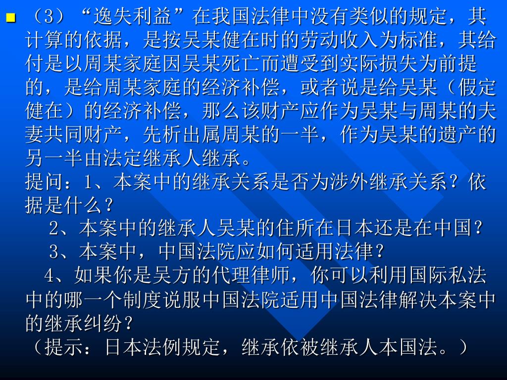 (3)“逸失利益”在我国法律中没有类似的规定,其计算的依据,是按吴某健在时的劳动收入为标准,其给付是以周某家庭因吴某死亡而遭受到实际损失为前提的,是给周某家庭的经济补偿,或者说是给吴某(假定健在)的经济补偿,那么该财产应作为吴某与周某的夫妻共同财产,先析出属周某的一半,作为吴某的遗产的另一半由法定继承人继承。提问:1、本案中的继承关系是否为涉外继承关系?依据是什么?2、本案中的继承人吴某的住所在日本还是在中国?3、本案中,中国法院应如何适用法律?4、如果你是吴方的代理律师,你可以利用国际私法中的哪一个制度说服中国法院适用中国法律解决本案中的继承纠纷?(提示:日本法例规定,继承依被继承人本国法。)(3)“逸失利益”在我国法律中没有类似的规定,其计算的依据,是按吴某健在时的劳动收入为标准,其给付是以周某家庭因吴某死亡而遭受到实际损失为前提的,是给周某家庭的经济补偿,或者说是给吴某(假定健在)的经济补偿,那么该财产应作为吴某与周某的夫妻共同财产,先析出属周某的一半,作为吴某的遗产的另一半由法定继承人继承。提问:1、本案中的继承关系是否为涉外继承关系?依据是什么?2、本案中的继承人吴某的住所在日本还是在中国?3、本案中,中国法院应如何适用法律?4、如果你是吴方的代理律师,你可以利用国际私法中的哪一个制度说服中国法院适用中国法律解决本案中的继承纠纷?(提示:日本法例规定,继承依被继承人本国法。)