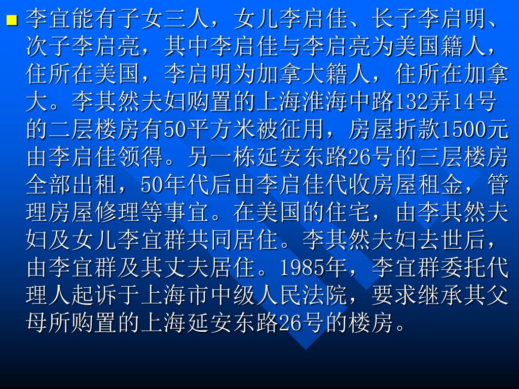 李宜能有子女三人,女儿李启佳、长子李启明、次子李启亮,其中李启佳与李启亮为美国籍人,住所在美国,李启明为加拿大籍人,住所在加拿大。李其然夫妇购置的上海淮海中路132弄14号的二层楼房有50平方米被征用,房屋折款1500元由李启佳领得。另一栋延安东路26号的三层楼房全部出租,50年代后由李启佳代收房屋租金,管理房屋修理等事宜。在美国的住宅,由李其然夫妇及女儿李宜群共同居住。李其然夫妇去世后,由李宜群及其丈夫居住。1985年,李宜群委托代理人起诉于上海市中级人民法院,要求继承其父母所购置的上海延安东路26号的楼房。李宜能有子女三人,女儿李启佳、长子李启明、次子李启亮,其中李启佳与李启亮为美国籍人,住所在美国,李启明为加拿大籍人,住所在加拿大。李其然夫妇购置的上海淮海中路132弄14号的二层楼房有50平方米被征用,房屋折款1500元由李启佳领得。另一栋延安东路26号的三层楼房全部出租,50年代后由李启佳代收房屋租金,管理房屋修理等事宜。在美国的住宅,由李其然夫妇及女儿李宜群共同居住。李其然夫妇去世后,由李宜群及其丈夫居住。1985年,李宜群委托代理人起诉于上海市中级人民法院,要求继承其父母所购置的上海延安东路26号的楼房。