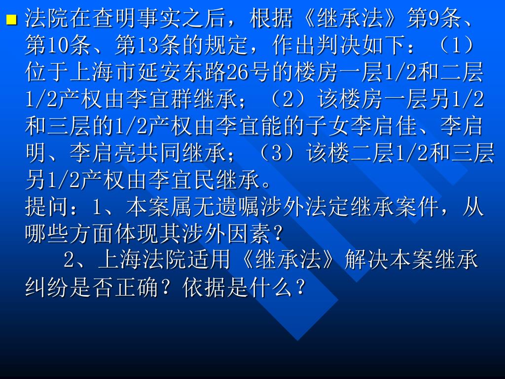 法院在查明事实之后,根据《继承法》第9条、第10条、第13条的规定,作出判决如下:(1)位于上海市延安东路26号的楼房一层1/2和二层1/2产权由李宜群继承;(2)该楼房一层另1/2和三层的1/2产权由李宜能的子女李启佳、李启明、李启亮共同继承;(3)该楼二层1/2和三层另1/2产权由李宜民继承。提问:1、本案属无遗嘱涉外法定继承案件,从哪些方面体现其涉外因素?2、上海法院适用《继承法》解决本案继承纠纷是否正确?依据是什么?法院在查明事实之后,根据《继承法》第9条、第10条、第13条的规定,作出判决如下:(1)位于上海市延安东路26号的楼房一层1/2和二层1/2产权由李宜群继承;(2)该楼房一层另1/2和三层的1/2产权由李宜能的子女李启佳、李启明、李启亮共同继承;(3)该楼二层1/2和三层另1/2产权由李宜民继承。提问:1、本案属无遗嘱涉外法定继承案件,从哪些方面体现其涉外因素?2、上海法院适用《继承法》解决本案继承纠纷是否正确?依据是什么?