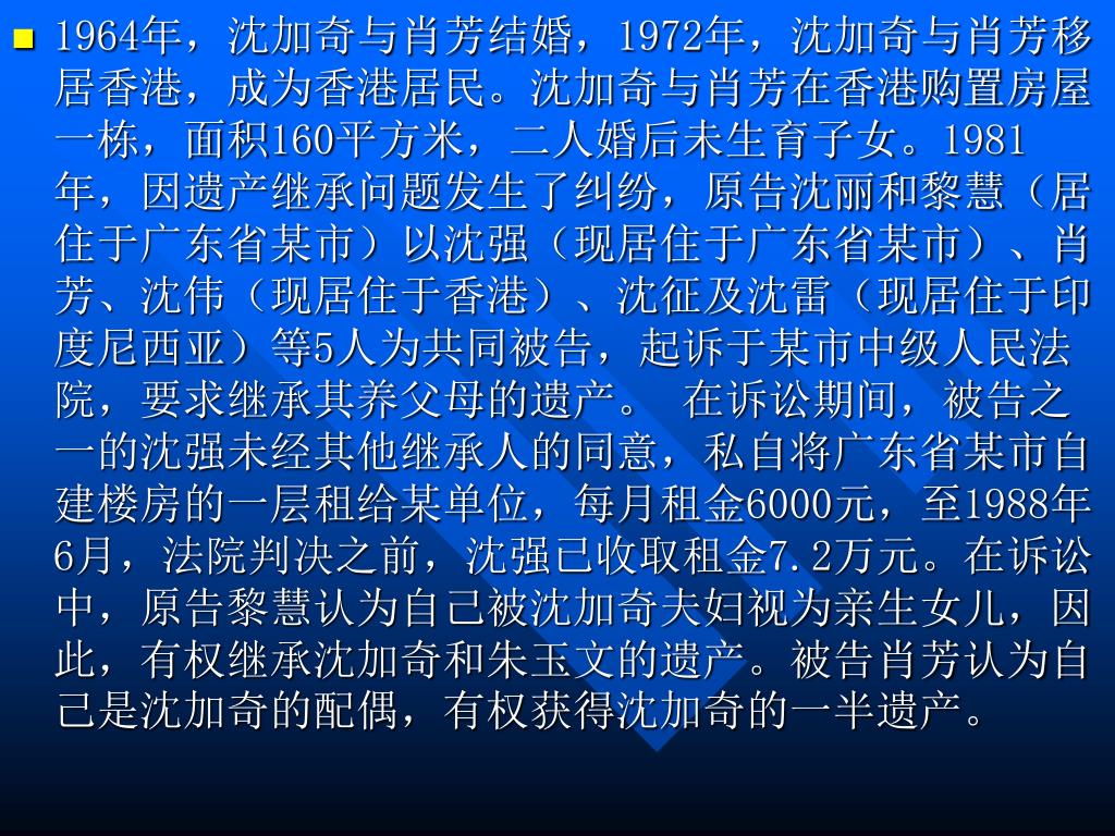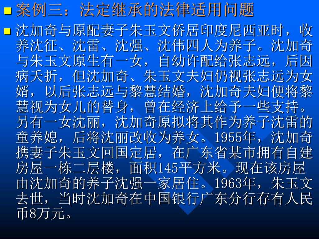 案例三:法定继承的法律适用问题 • 沈加奇与原配妻子朱玉文侨居印度尼西亚时,收养沈征、沈雷、沈强、沈伟四人为养子。沈加奇与朱玉文原生有一女,自幼许配给张志远,后因病夭折,但沈加奇、朱玉文夫妇仍视张志远为女婿,以后张志远与黎慧结婚,沈加奇夫妇便将黎慧视为女儿的替身,曾在经济上给予一些支持。另有一女沈丽,沈加奇原拟将其作为养子沈雷的童养媳,后将沈丽改收为养女。1955年,沈加奇携妻子朱玉文回国定居,在广东省某市拥有自建房屋一栋二层楼,面积145平方米。现在该房屋由沈加奇的养子沈强一家居住。1963年,朱玉文去世,当时沈加奇在中国银行广东分行存有人民币8万元。