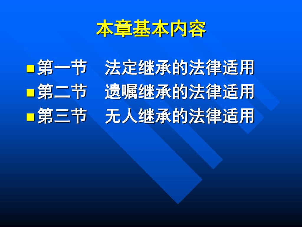 本章基本内容 • 第一节 法定继承的法律适用 • 第二节 遗嘱继承的法律适用 • 第三节 无人继承的法律适用