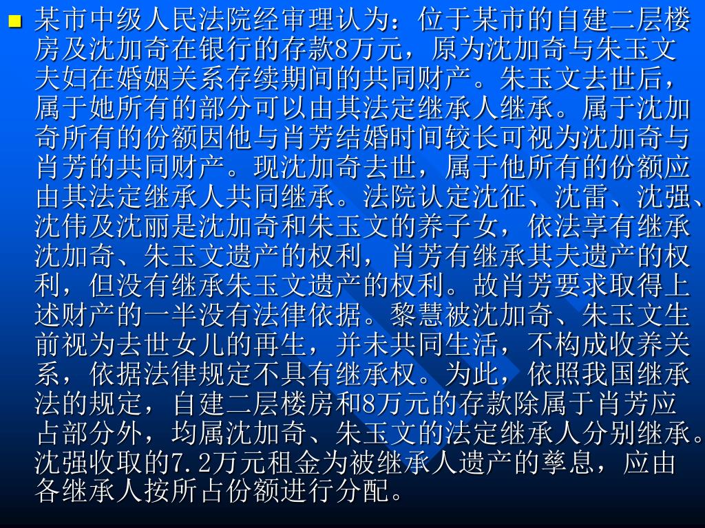 某市中级人民法院经审理认为:位于某市的自建二层楼房及沈加奇在银行的存款8万元,原为沈加奇与朱玉文夫妇在婚姻关系存续期间的共同财产。朱玉文去世后,属于她所有的部分可以由其法定继承人继承。属于沈加奇所有的份额因他与肖芳结婚时间较长可视为沈加奇与肖芳的共同财产。现沈加奇去世,属于他所有的份额应由其法定继承人共同继承。法院认定沈征、沈雷、沈强、沈伟及沈丽是沈加奇和朱玉文的养子女,依法享有继承沈加奇、朱玉文遗产的权利,肖芳有继承其夫遗产的权利,但没有继承朱玉文遗产的权利。故肖芳要求取得上述财产的一半没有法律依据。黎慧被沈加奇、朱玉文生前视为去世女儿的再生,并未共同生活,不构成收养关系,依据法律规定不具有继承权。为此,依照我国继承法的规定,自建二层楼房和8万元的存款除属于肖芳应占部分外,均属沈加奇、朱玉文的法定继承人分别继承。沈强收取的7.2万元租金为被继承人遗产的孳息,应由各继承人按所占份额进行分配。某市中级人民法院经审理认为:位于某市的自建二层楼房及沈加奇在银行的存款8万元,原为沈加奇与朱玉文夫妇在婚姻关系存续期间的共同财产。朱玉文去世后,属于她所有的部分可以由其法定继承人继承。属于沈加奇所有的份额因他与肖芳结婚时间较长可视为沈加奇与肖芳的共同财产。现沈加奇去世,属于他所有的份额应由其法定继承人共同继承。法院认定沈征、沈雷、沈强、沈伟及沈丽是沈加奇和朱玉文的养子女,依法享有继承沈加奇、朱玉文遗产的权利,肖芳有继承其夫遗产的权利,但没有继承朱玉文遗产的权利。故肖芳要求取得上述财产的一半没有法律依据。黎慧被沈加奇、朱玉文生前视为去世女儿的再生,并未共同生活,不构成收养关系,依据法律规定不具有继承权。为此,依照我国继承法的规定,自建二层楼房和8万元的存款除属于肖芳应占部分外,均属沈加奇、朱玉文的法定继承人分别继承。沈强收取的7.2万元租金为被继承人遗产的孳息,应由各继承人按所占份额进行分配。