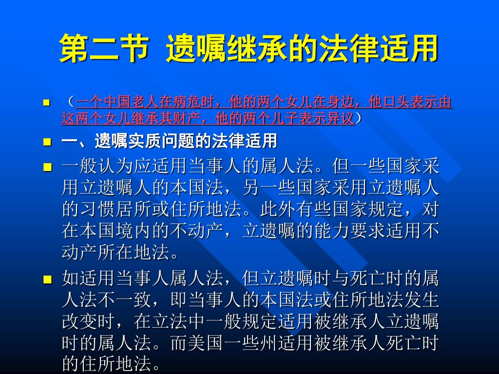 第二节 遗嘱继承的法律适用 • (一个中国老人在病危时,他的两个女儿在身边,他口头表示由这两个女儿继承其财产,他的两个儿子表示异议) • 一、遗嘱实质问题的法律适用 • 一般认为应适用当事人的属人法。但一些国家采用立遗嘱人的本国法,另一些国家采用立遗嘱人的习惯居所或住所地法。此外有些国家规定,对在本国境内的不动产,立遗嘱的能力要求适用不动产所在地法。 • 如适用当事人属人法,但立遗嘱时与死亡时的属人法不一致,即当事人的本国法或住所地法发生改变时,在立法中一般规定适用被继承人立遗嘱时的属人法。而美国一些州适用被继承人死亡时的住所地法。