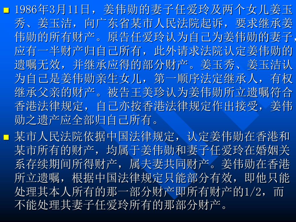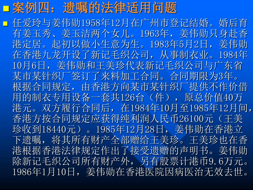 案例四:遗嘱的法律适用问题 • 任爱玲与姜伟勋1958年12月在广州市登记结婚。婚后育有姜玉秀、姜玉洁两个女儿。1963年,姜伟勋只身赴香港定居。起初以做小生意为生。1983年5月2日,姜伟勋在香港九龙开设了新记毛织公司,从事制衣业。1984年10月6日,姜伟勋和王美珍代表新记毛织公司与广东省某市某针织厂签订了来料加工合同。合同期限为3年。根据合同规定,由香港方向某市某针织厂提供不作价借用的制衣专用设备一套共126台(件),原总价值40万港元。双方履行合同后,在1984年10月至1985年12月间,香港方按合同规定应获得纯利润人民币26100元(王美珍收到18440元)。1985年12月28日,姜伟勋在香港立下遗嘱,将其所有财产全部赠给王美珍。王美珍也在香港根据香港法律规定作出了接受遗赠的声明书。姜伟勋除新记毛织公司所有财产外,另有股票计港币9.6万元。1986年1月10日,姜伟勋在香港医院因病医治无效去世。