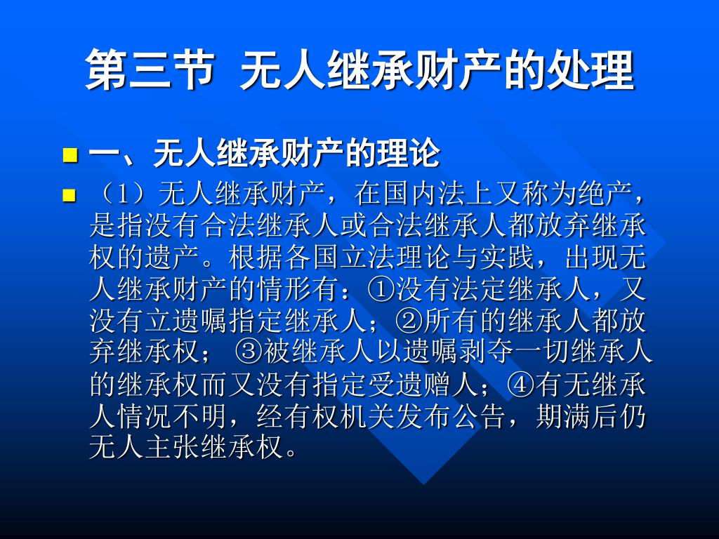 第三节 无人继承财产的处理 • 一、无人继承财产的理论 • (1)无人继承财产,在国内法上又称为绝产,是指没有合法继承人或合法继承人都放弃继承权的遗产。根据各国立法理论与实践,出现无人继承财产的情形有:①没有法定继承人,又没有立遗嘱指定继承人;②所有的继承人都放弃继承权; ③被继承人以遗嘱剥夺一切继承人的继承权而又没有指定受遗赠人;④有无继承人情况不明,经有权机关发布公告,期满后仍无人主张继承权。