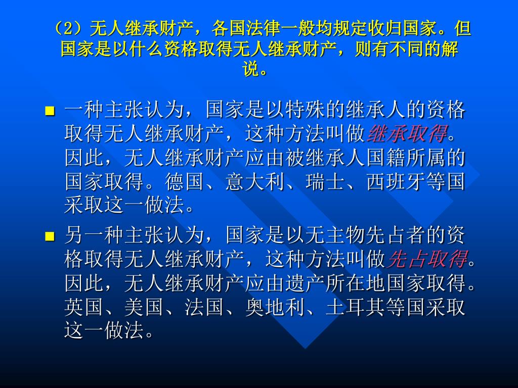 (2)无人继承财产,各国法律一般均规定收归国家。但国家是以什么资格取得无人继承财产,则有不同的解说。(2)无人继承财产,各国法律一般均规定收归国家。但国家是以什么资格取得无人继承财产,则有不同的解说。 • 一种主张认为,国家是以特殊的继承人的资格取得无人继承财产,这种方法叫做继承取得。因此,无人继承财产应由被继承人国籍所属的国家取得。德国、意大利、瑞士、西班牙等国采取这一做法。 • 另一种主张认为,国家是以无主物先占者的资格取得无人继承财产,这种方法叫做先占取得。因此,无人继承财产应由遗产所在地国家取得。英国、美国、法国、奥地利、土耳其等国采取这一做法。