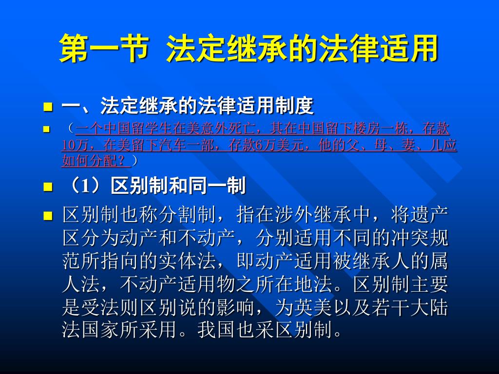 第一节 法定继承的法律适用 • 一、法定继承的法律适用制度 • (一个中国留学生在美意外死亡,其在中国留下楼房一栋,存款10万,在美留下汽车一部,存款6万美元,他的父、母、妻、儿应如何分配?) • (1)区别制和同一制 • 区别制也称分割制,指在涉外继承中,将遗产区分为动产和不动产,分别适用不同的冲突规范所指向的实体法,即动产适用被继承人的属人法,不动产适用物之所在地法。区别制主要是受法则区别说的影响,为英美以及若干大陆法国家所采用。我国也采区别制。