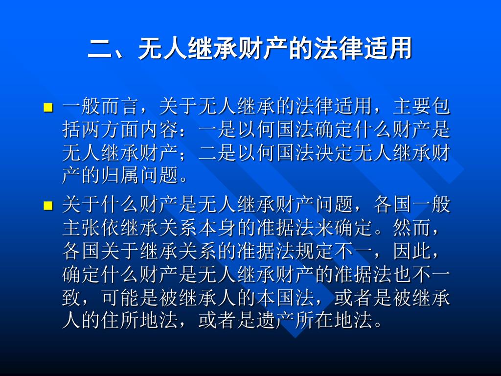 二、无人继承财产的法律适用 • 一般而言,关于无人继承的法律适用,主要包括两方面内容:一是以何国法确定什么财产是无人继承财产;二是以何国法决定无人继承财产的归属问题。 • 关于什么财产是无人继承财产问题,各国一般主张依继承关系本身的准据法来确定。然而,各国关于继承关系的准据法规定不一,因此,确定什么财产是无人继承财产的准据法也不一致,可能是被继承人的本国法,或者是被继承人的住所地法,或者是遗产所在地法。