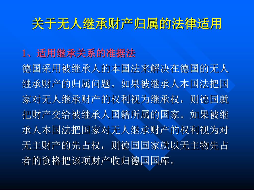 关于无人继承财产归属的法律适用 1、适用继承关系的准据法 德国采用被继承人的本国法来解决在德国的无人 继承财产的归属问题。如果被继承人本国法把国 家对无人继承财产的权利视为继承权,则德国就 把财产交给被继承人国籍所属的国家。如果被继 承人本国法把国家对无人继承财产的权利视为对 无主财产的先占权,则德国国家就以无主物先占 者的资格把该项财产收归德国国库。