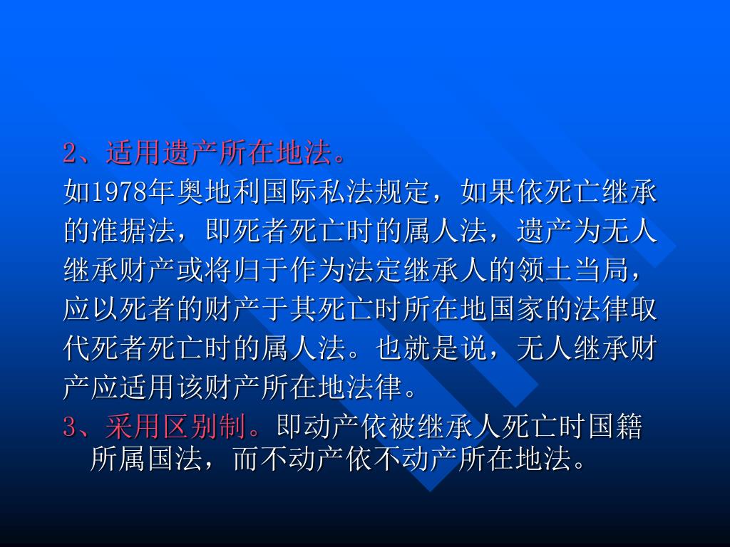 2、适用遗产所在地法。 如1978年奥地利国际私法规定,如果依死亡继承 的准据法,即死者死亡时的属人法,遗产为无人 继承财产或将归于作为法定继承人的领土当局, 应以死者的财产于其死亡时所在地国家的法律取 代死者死亡时的属人法。也就是说,无人继承财 产应适用该财产所在地法律。 3、采用区别制。即动产依被继承人死亡时国籍所属国法,而不动产依不动产所在地法。