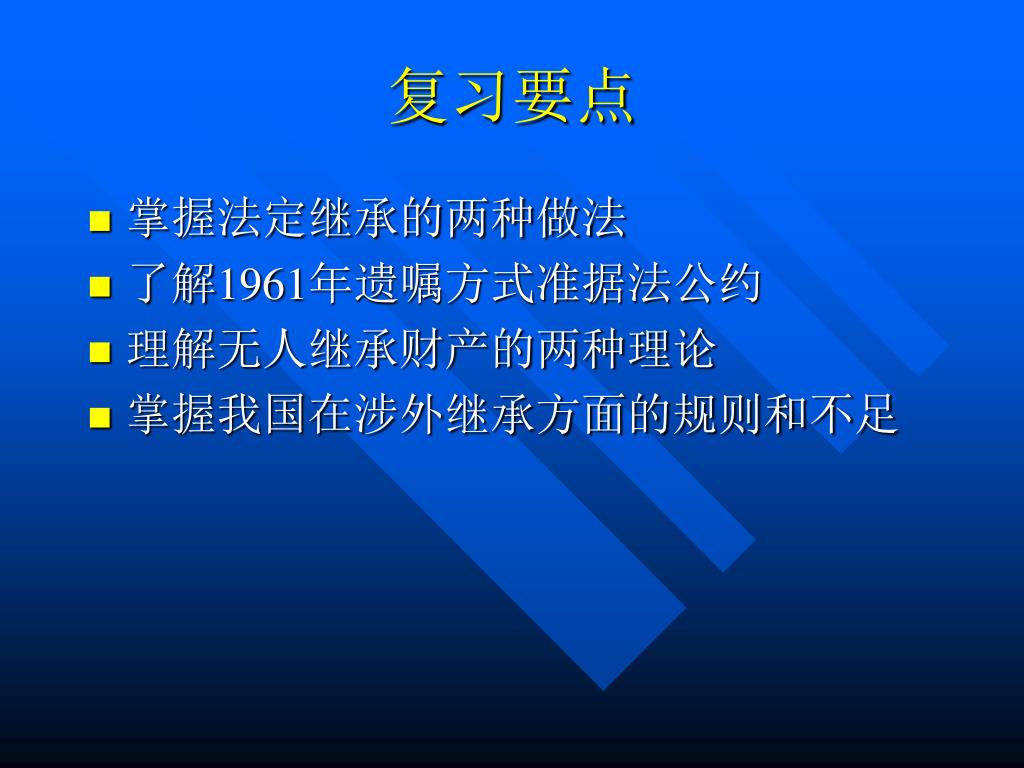 复习要点 • 掌握法定继承的两种做法 • 了解1961年遗嘱方式准据法公约 • 理解无人继承财产的两种理论 • 掌握我国在涉外继承方面的规则和不足