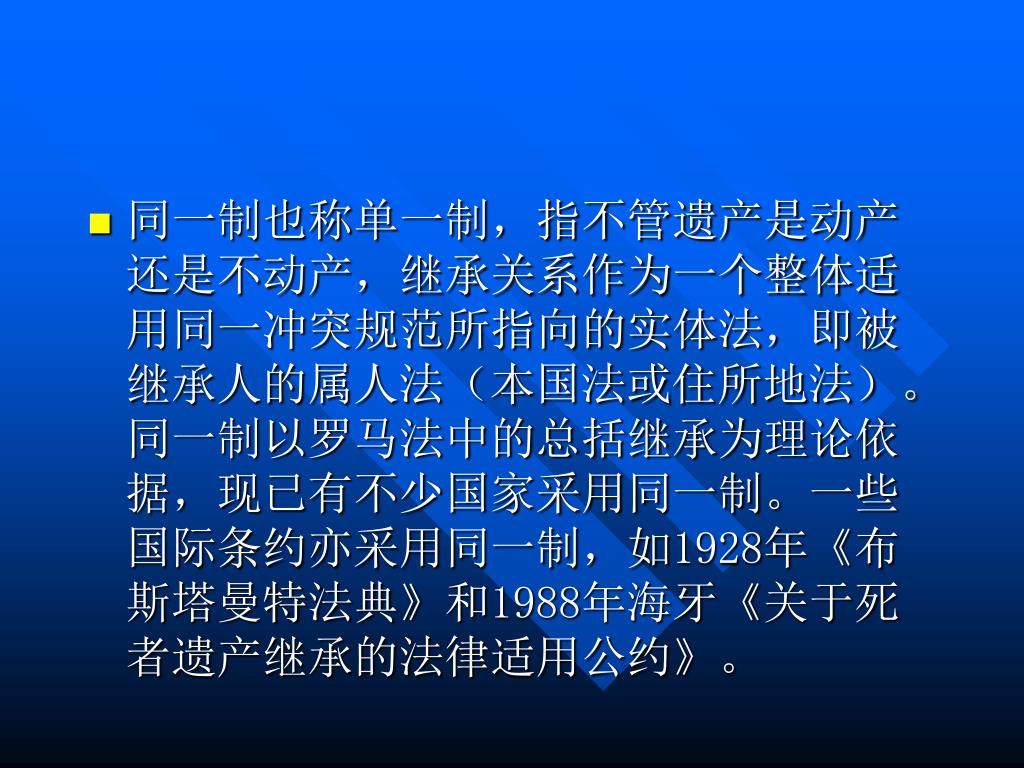 同一制也称单一制,指不管遗产是动产还是不动产,继承关系作为一个整体适用同一冲突规范所指向的实体法,即被继承人的属人法(本国法或住所地法)。同一制以罗马法中的总括继承为理论依据,现已有不少国家采用同一制。一些国际条约亦采用同一制,如1928年《布斯塔曼特法典》和1988年海牙《关于死者遗产继承的法律适用公约》。同一制也称单一制,指不管遗产是动产还是不动产,继承关系作为一个整体适用同一冲突规范所指向的实体法,即被继承人的属人法(本国法或住所地法)。同一制以罗马法中的总括继承为理论依据,现已有不少国家采用同一制。一些国际条约亦采用同一制,如1928年《布斯塔曼特法典》和1988年海牙《关于死者遗产继承的法律适用公约》。