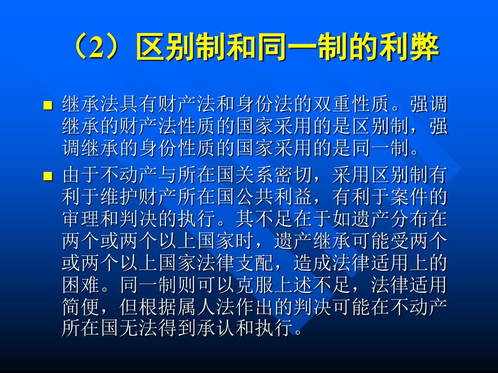(2)区别制和同一制的利弊 • 继承法具有财产法和身份法的双重性质。强调继承的财产法性质的国家采用的是区别制,强调继承的身份性质的国家采用的是同一制。 • 由于不动产与所在国关系密切,采用区别制有利于维护财产所在国公共利益,有利于案件的审理和判决的执行。其不足在于如遗产分布在两个或两个以上国家时,遗产继承可能受两个或两个以上国家法律支配,造成法律适用上的困难。同一制则可以克服上述不足,法律适用简便,但根据属人法作出的判决可能在不动产所在国无法得到承认和执行。