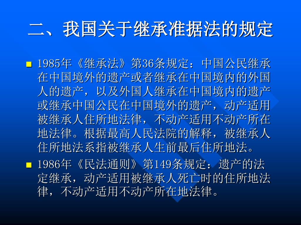 二、我国关于继承准据法的规定 • 1985年《继承法》第36条规定:中国公民继承在中国境外的遗产或者继承在中国境内的外国人的遗产,以及外国人继承在中国境内的遗产或继承中国公民在中国境外的遗产,动产适用被继承人住所地法律,不动产适用不动产所在地法律。根据最高人民法院的解释,被继承人住所地法系指被继承人生前最后住所地法。 • 1986年《民法通则》第149条规定:遗产的法定继承,动产适用被继承人死亡时的住所地法律,不动产适用不动产所在地法律。
