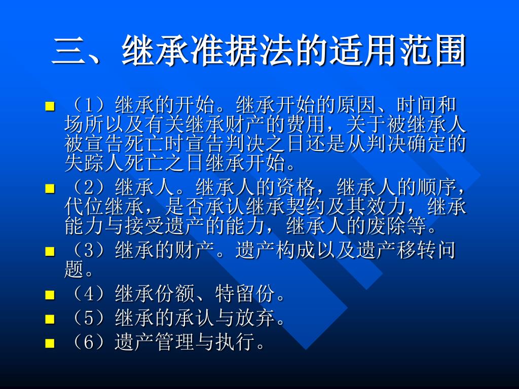 三、继承准据法的适用范围 • (1)继承的开始。继承开始的原因、时间和场所以及有关继承财产的费用,关于被继承人被宣告死亡时宣告判决之日还是从判决确定的失踪人死亡之日继承开始。 • (2)继承人。继承人的资格,继承人的顺序,代位继承,是否承认继承契约及其效力,继承能力与接受遗产的能力,继承人的废除等。 • (3)继承的财产。遗产构成以及遗产移转问题。 • (4)继承份额、特留份。 • (5)继承的承认与放弃。 • (6)遗产管理与执行。