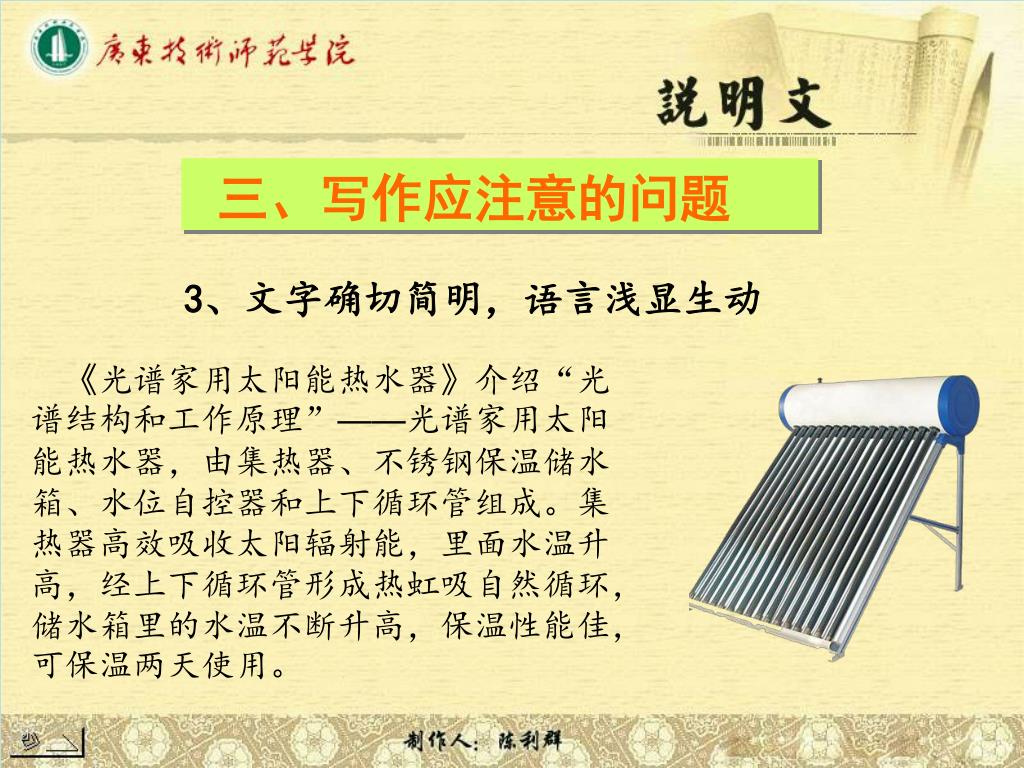 三、写作应注意的问题. 3 、文字确切简明,语言浅显生动. 《 光谱家用太阳能热水器 》 介绍“光谱结构和工作原理” —— 光谱家用太阳能热水器,由集热器、不锈钢保温储水箱、水位自控器和上下循环管组成。集热器高效吸收太阳辐射能,里面水温升高,经上下循环管形成热虹吸自然循环,储水箱里的水温不断升高,保温性能佳,可保温两天使用。. 梁园是省级重点文物保护单位, 广东清代粤中四大名园之一,始建 于清代嘉庆年间(1796-18 20),是佛山梁氏家族粱蔼如、 梁九章、梁九华、梁九图叔侄四人 所营造的大规模私家园林,包括十 二石斋、寒香馆、群星草堂、汾江