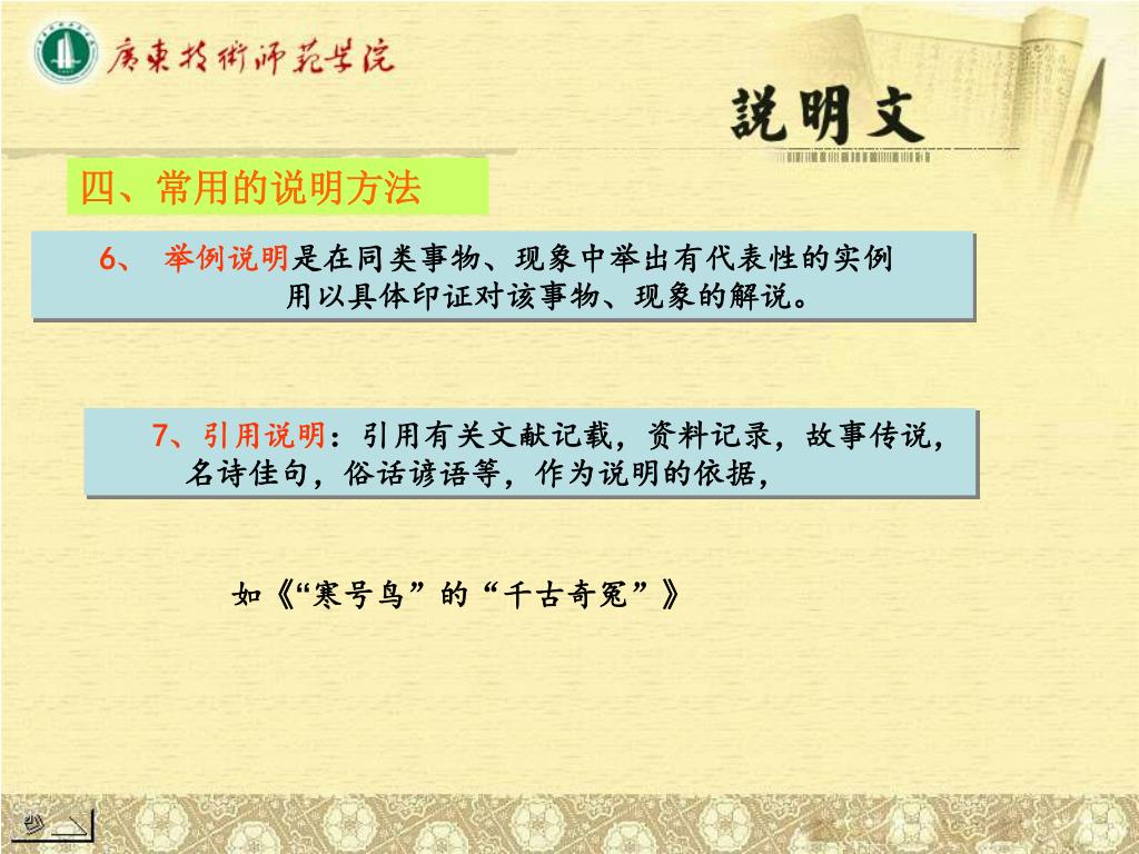 四、常用的说明方法 6、 举例说明是在同类事物、现象中举出有代表性的实例 用以具体印证对该事物、现象的解说。 7、引用说明:引用有关文献记载,资料记录,故事传说, 名诗佳句,俗话谚语等,作为说明的依据, 如《“寒号鸟”的“千古奇冤”》