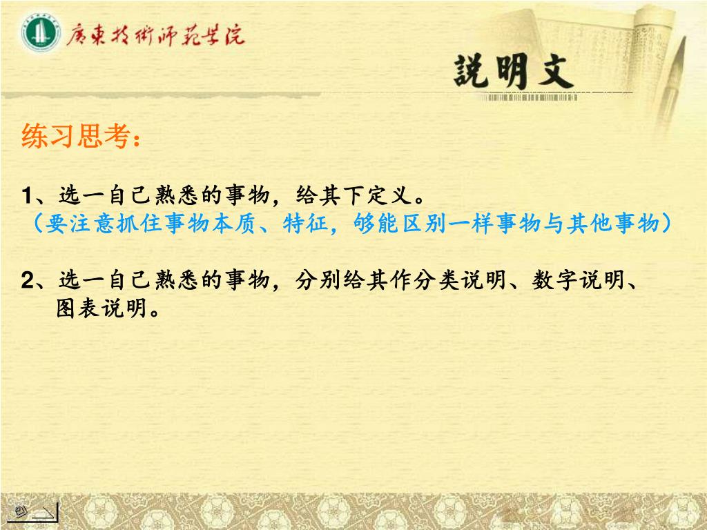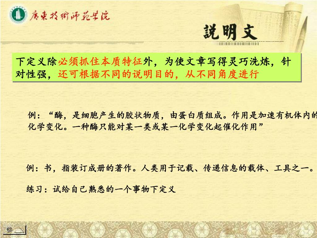 下定义除必须抓住本质特征外,为使文章写得灵巧洗炼,针对性强,还可根据不同的说明目的,从不同角度进行下定义除必须抓住本质特征外,为使文章写得灵巧洗炼,针对性强,还可根据不同的说明目的,从不同角度进行 例:“酶,是细胞产生的胶状物质,由蛋白质组成。作用是加速有机体内的 化学变化。一种酶只能对某一类或某一化学变化起催化作用” 例:书,指装订成册的著作。人类用于记载、传递信息的载体、工具之一。 练习:试给自己熟悉的一个事物下定义