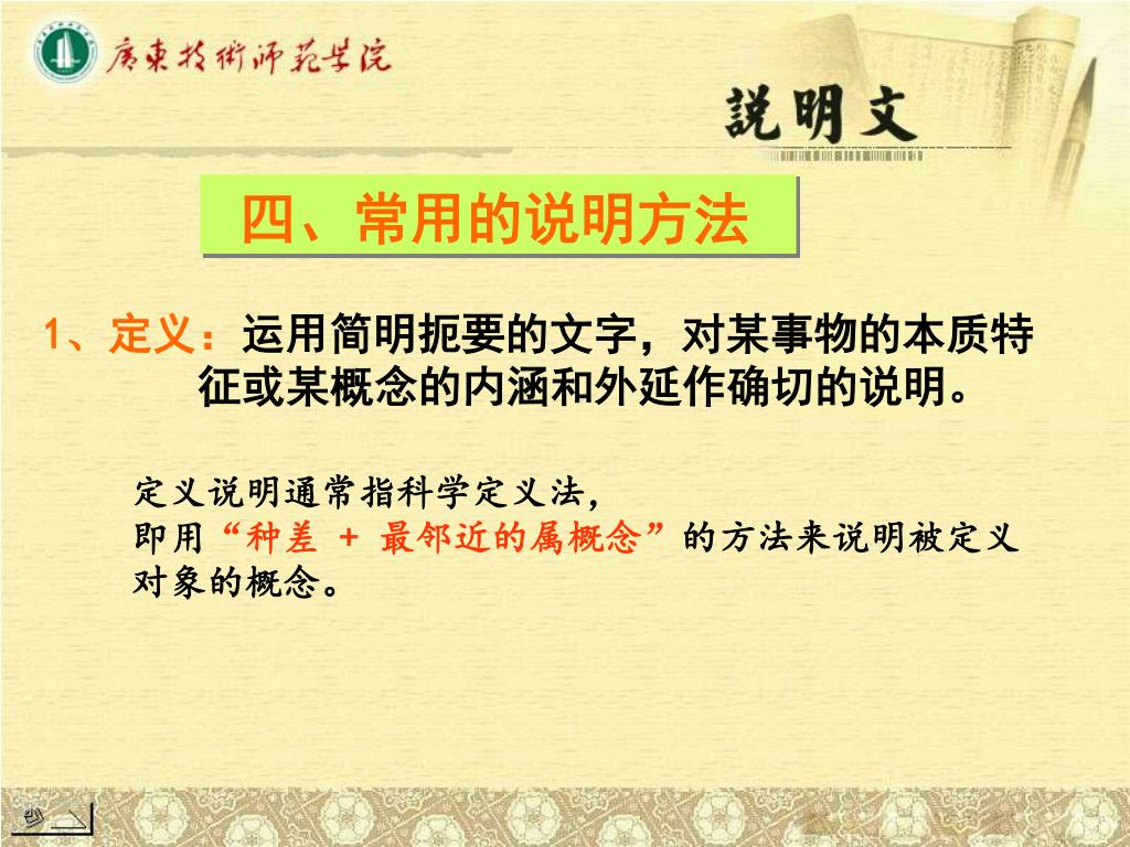 四、常用的说明方法 1、定义:运用简明扼要的文字,对某事物的本质特 征或某概念的内涵和外延作确切的说明。 定义说明通常指科学定义法, 即用“种差 + 最邻近的属概念”的方法来说明被定义 对象的概念。