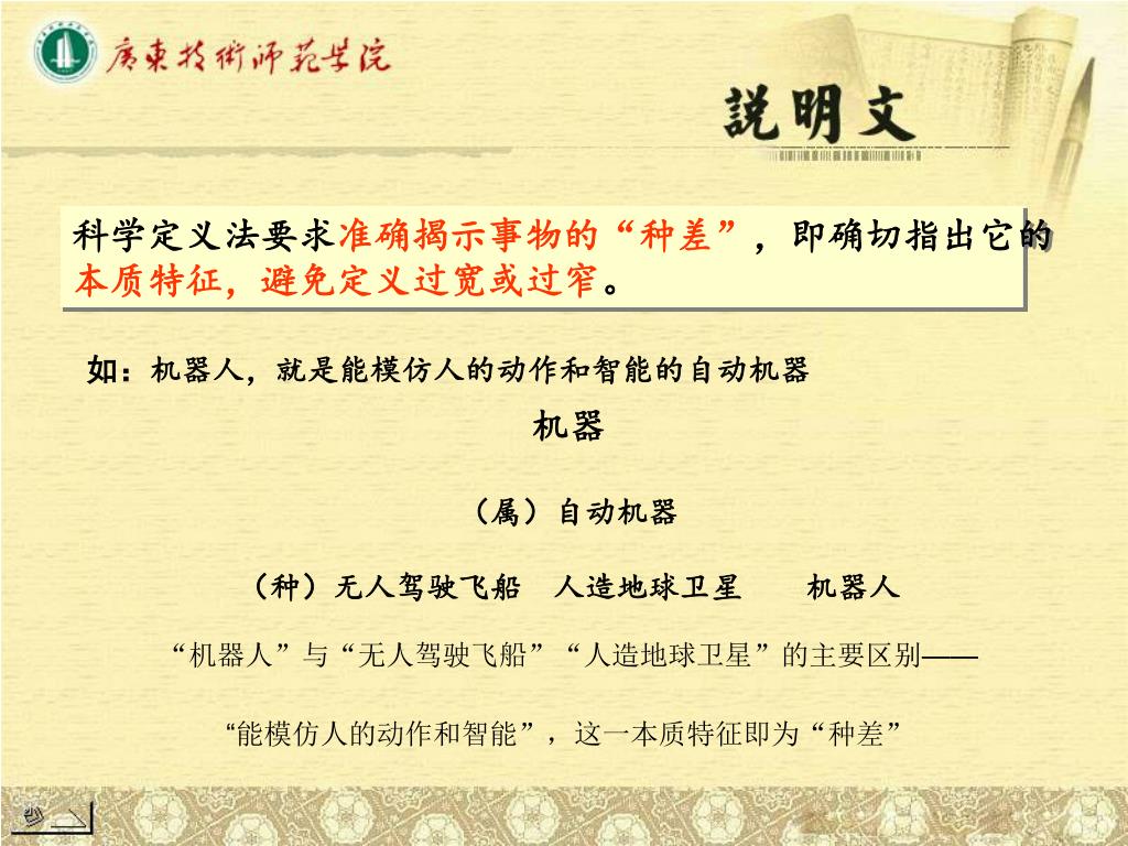 科学定义法要求准确揭示事物的“种差”,即确切指出它的科学定义法要求准确揭示事物的“种差”,即确切指出它的 本质特征,避免定义过宽或过窄。 如:机器人,就是能模仿人的动作和智能的自动机器 机器 (属)自动机器 (种)无人驾驶飞船 人造地球卫星 机器人 “机器人”与“无人驾驶飞船”“人造地球卫星”的主要区别—— “能模仿人的动作和智能”,这一本质特征即为“种差”