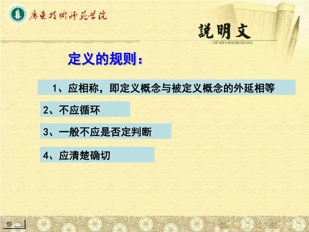 定义的规则: 1、应相称,即定义概念与被定义概念的外延相等 2、不应循环 3、一般不应是否定判断 4、应清楚确切